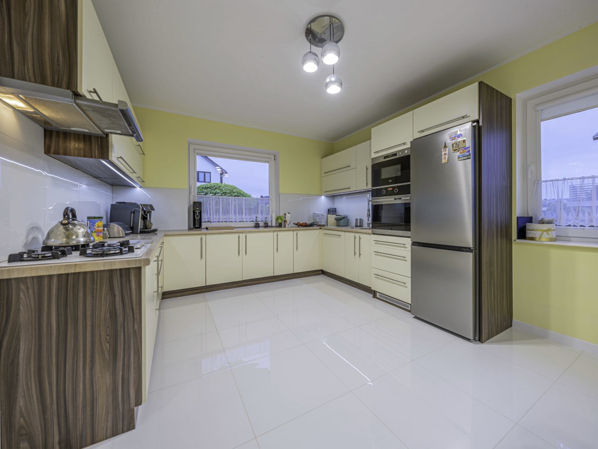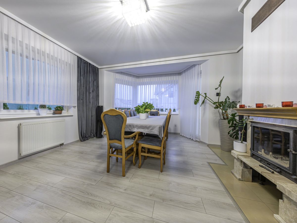 Okna domu PCV złoty dąb. Dom jest bardzo dobrze doświetlony - wystawa na cztery strony świata. Działka ogrodzona siatką a od strony wejścia do domu jest murek kamienny z dwoma bramami wjazdowymi na pilota. Płaska działka, ładnie zagospodarowana, częściowo wyłożona kostką a częściowo stanowi zagospodarowany ogród.