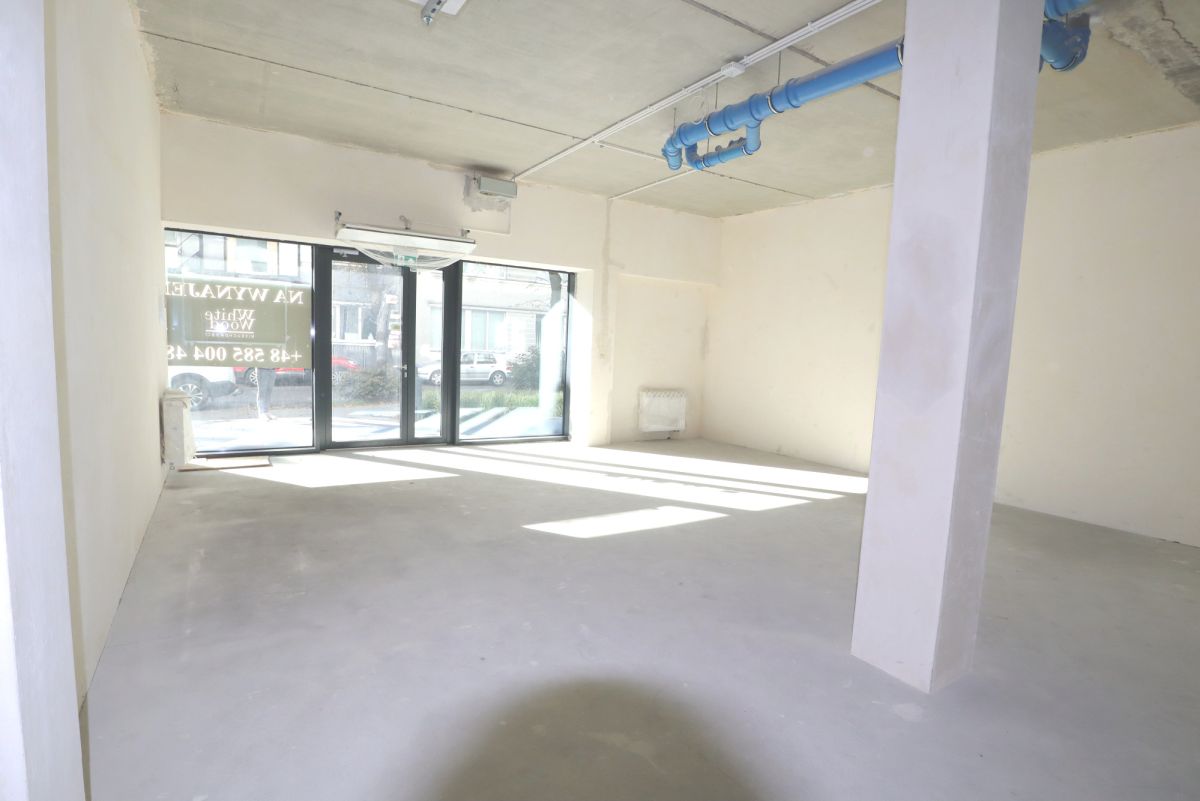 Mieści się na parterze apartamentowca. Posiada wysokie witryny od strony ulicy.