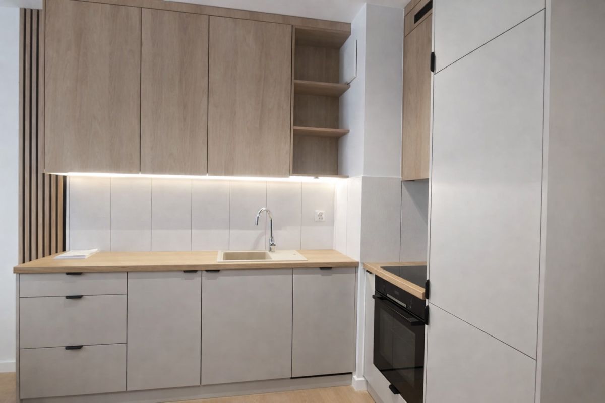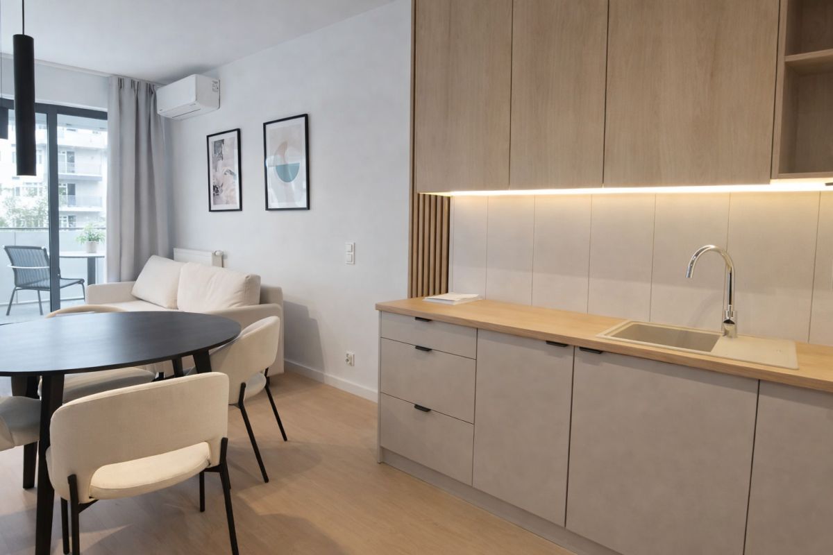 Lokal został zaprojektowany z dużą dbałością o funkcjonalność i wygodę. Układ obejmuje salon z aneksem kuchennym, wydzieloną część sypialnianą z pojemną szafą wnękową, łazienkę oraz przestronny balkon.
