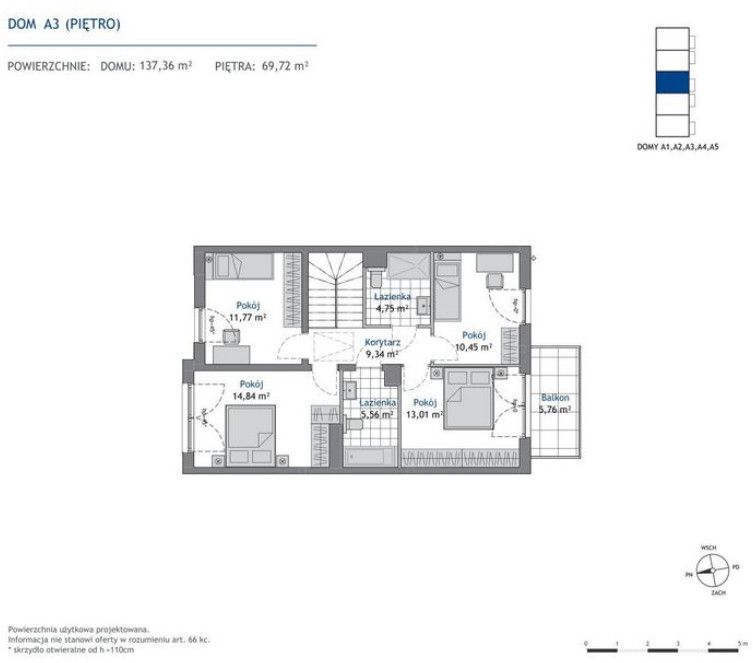 Dom oferuje cztery wygodne sypialnie, dwie łazienki, osobne WC oraz balkon, co zapewnia komfort nawet dla większej rodziny. Dodatkowym atutem jest garaż jednostanowiskowy o powierzchni 18,75 m², wliczony w metraż domu.