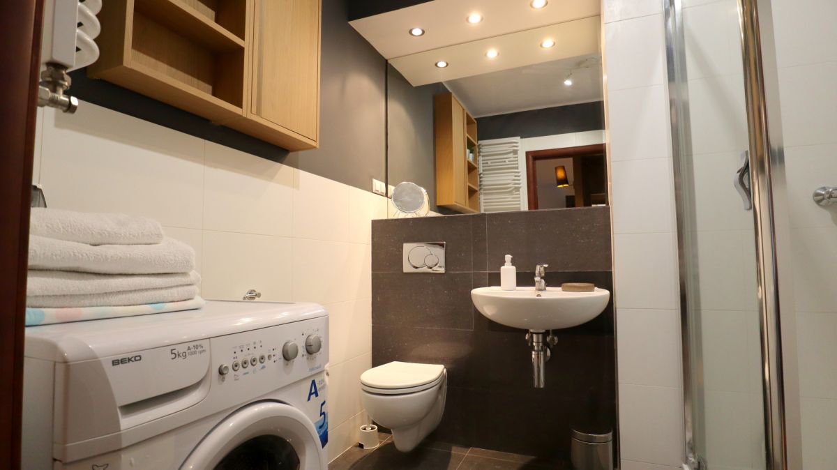 W łazience kabina, pralka.
