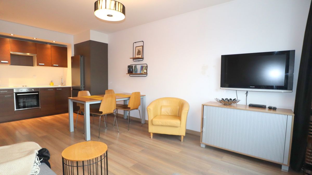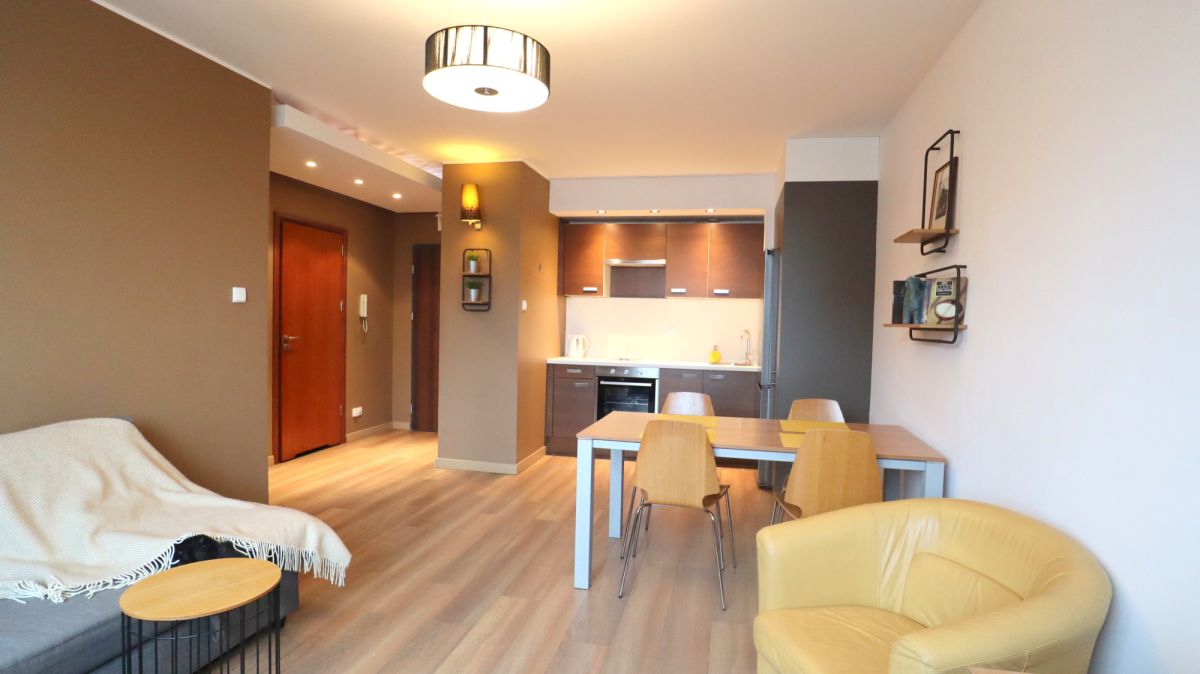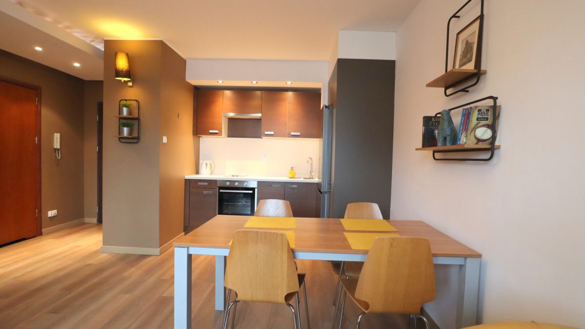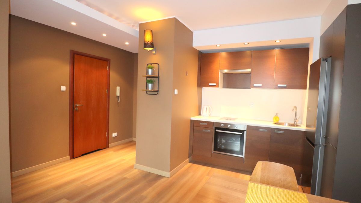 Lokal składa się z salonu z aneksem kuchennym, sypialni, łazienki wraz z WC oraz z przedpokoju. Całość umeblowana i wykończona. W kuchni sprzęt AGD (płyta grzewcza, piekarnik, lodówka i okap.). W sypialni duże łóżko i duża szafa wnękowa.